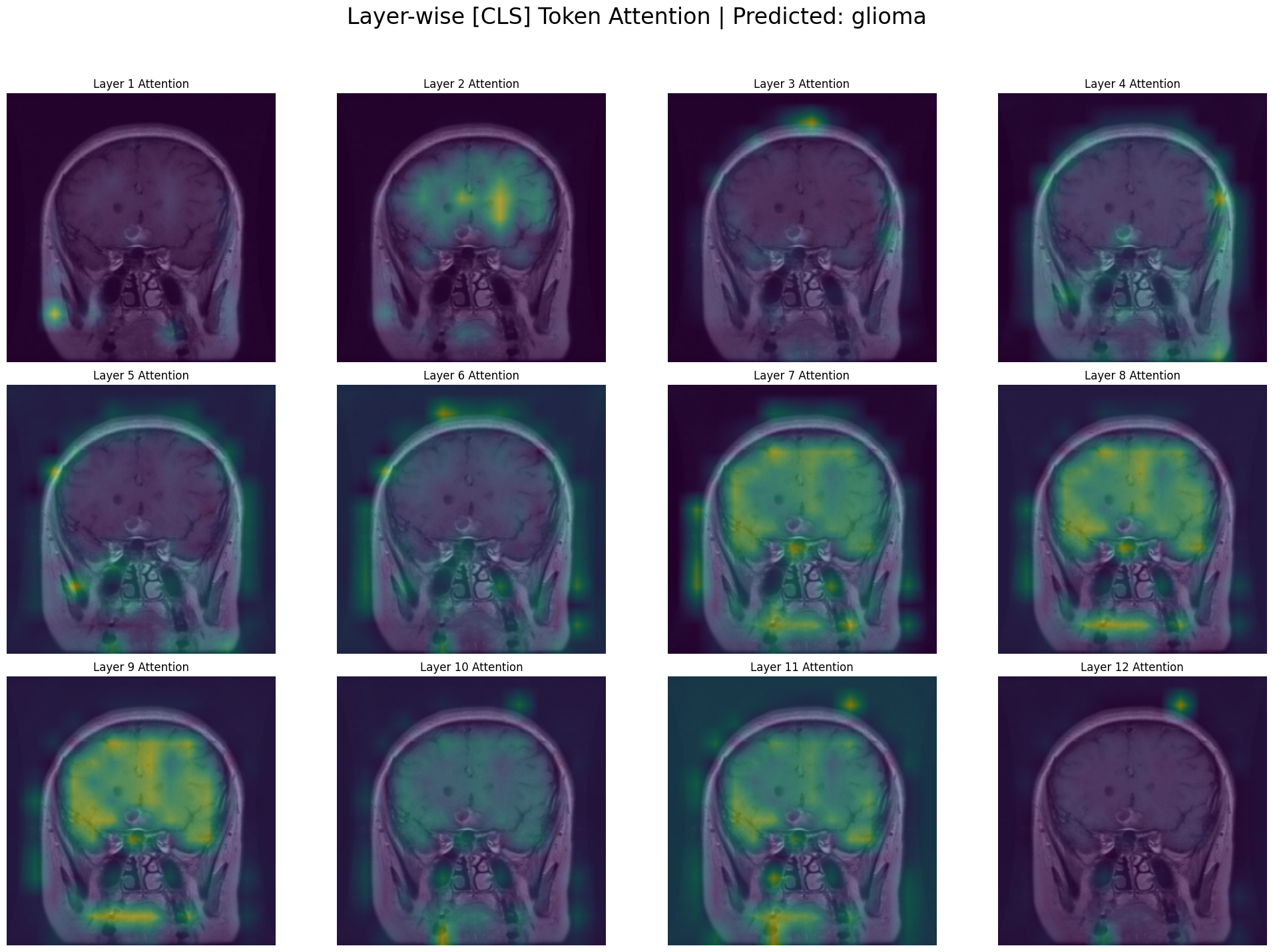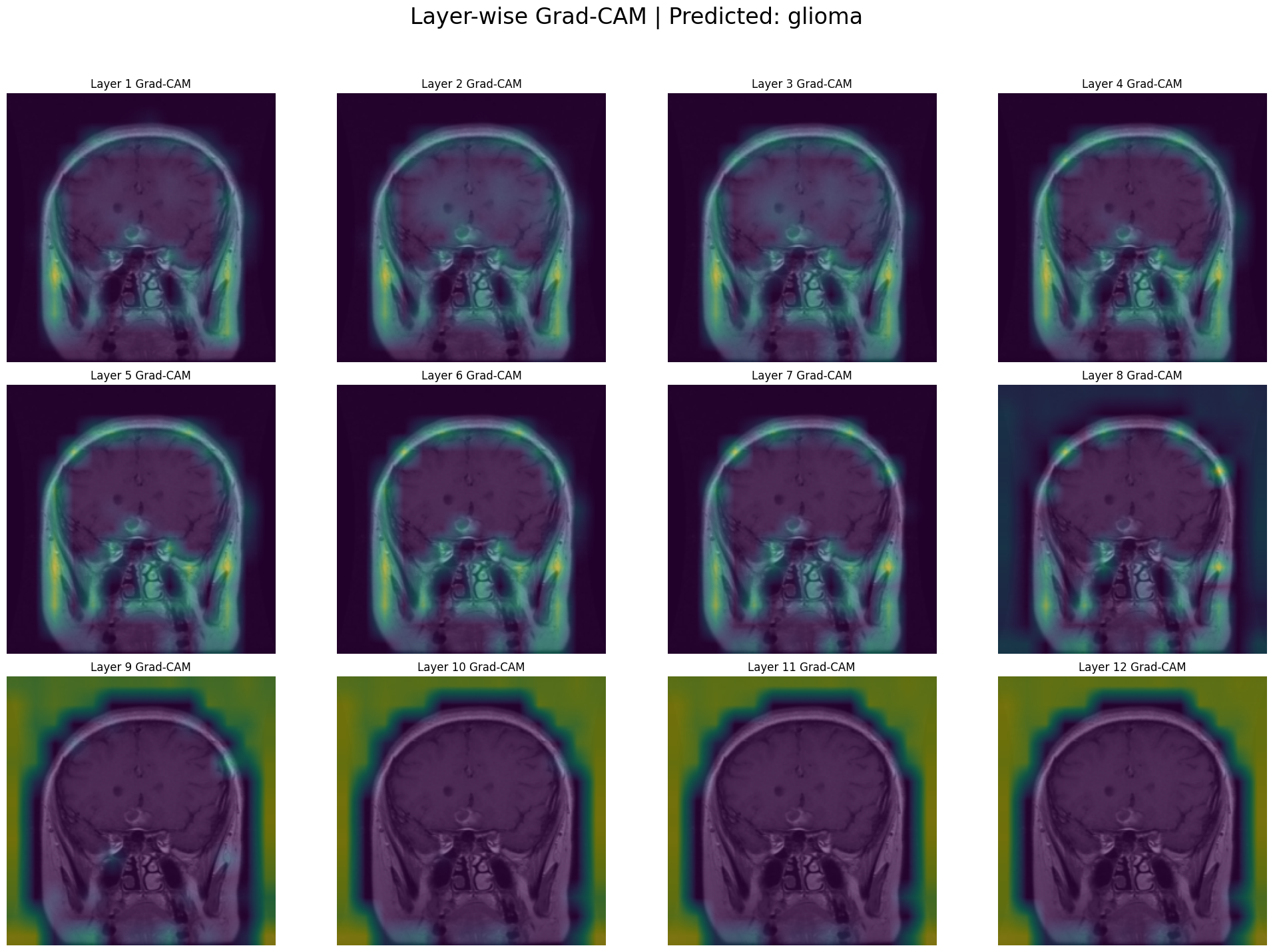 Unlike attention maps which show focus, Grad-CAM shows the importance for the final prediction at each layer. The early layers act like a basic feature extractor, searching for simple patterns like edges, textures, and gradients. The heatmaps are sparse and tend to highlight the outer edges of the head and skull rather than the brain tissue itself. The heatmaps in mid layers[5-8] move inward, and by Layers 7 and 8, a clear, focused hotspot appears directly over the location of the tumor in the upper left of the brain. In the last 4 layers, the focused hotspot from the middle layers disappears, and the heatmaps become extremely broad and diffuse, eventually covering the entire brain and surrounding area. It depicts that the tumor is present in the image, showcasing the entire figure of the image as evidence.