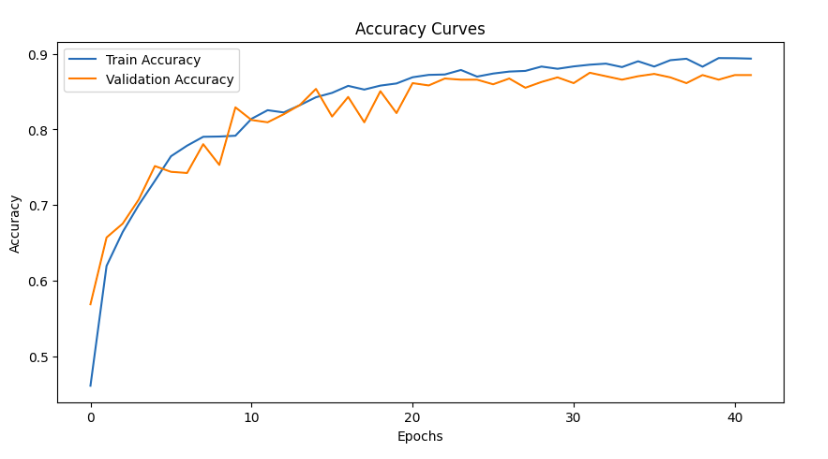 With these hyperparameters, VIT model was trained for about 100 epochs. However, the best perfomed model was obtained at epoch 32, after which the validation accuracy didn’t improve for about 10 more epochs. Thus, with the early stopping logic, the training stopped.
